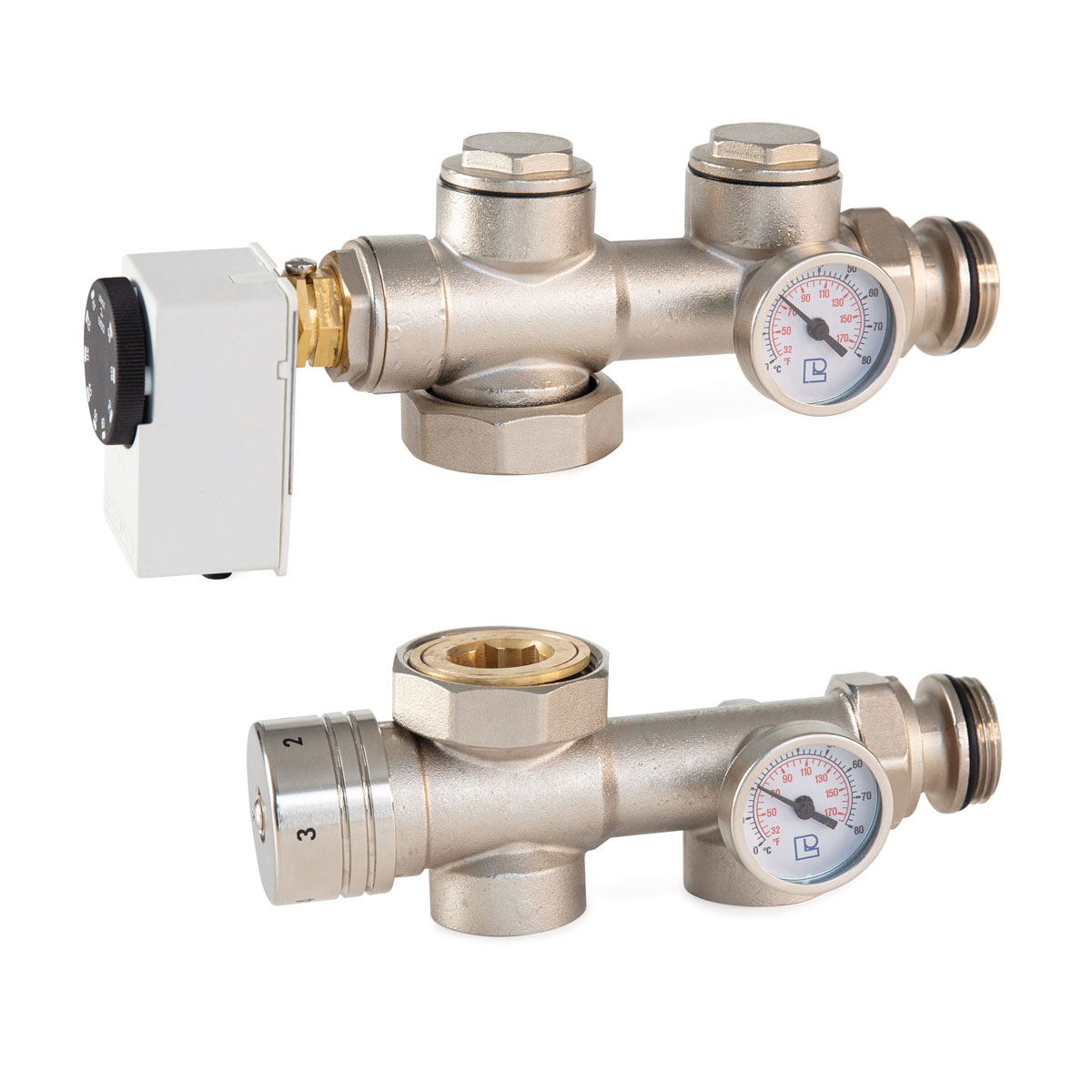 Adjustable mixing group with fixed point regulating unit with integrated sensor. Suitable for circulators G 1” 1/2 centre distance 130 mm and bracketed manifolds G 1” centre distance 200 mm. Complete with safety thermostat with immersion probe.