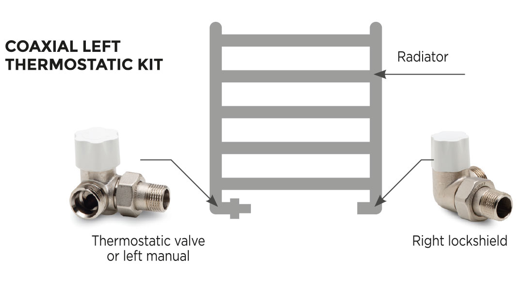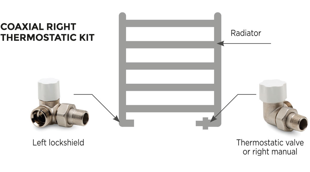 The coaxial valves have a headwork hat allows pre-regulation thanks to a shaped acetal ring. The thermostatic head allows the replacement of one of the sealing o-rings on the control rod without having to empty the system. The valves are produced with a nickel-plated finish. The seal of the lockshield is ensured by an o-ring on the shutter and, if necessary, by a second o-ring between the body and the cap. The seal in closing with the shutter is ensured by an o-ring and a metal conical seal. The lockshield are made with a nickel-plated finish. All lockshield can adjust the flow rate by limiting the shutter lift.