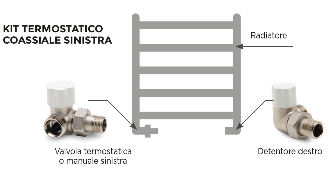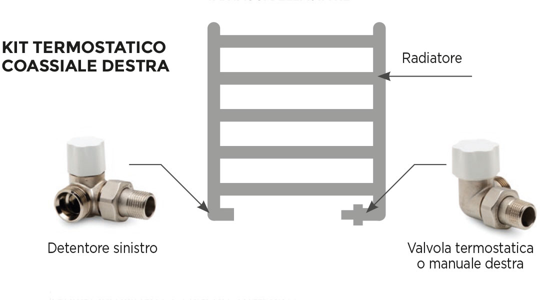 Las válvulas coaxiales tienen un tornillo que ofrece la posibilidad de preajuste gracias a un anillo de acetal perfilado. El tornillo termostático permite sustituir una de las juntas tóricas de la varilla de control sin necesidad de vaciar el sistema. Las válvulas se fabrican con un acabado niquelado. Los retenedores están sellados por una junta tórica en el tapón y, si es necesario, por una junta tórica adicional entre el cuerpo y el tapón. La estanqueidad del cierre con el tapón se consigue mediante una junta tórica y una junta cónica metálica. Los detentores están fabricados con un acabado niquelado. Todos los detentores tienen la opción de ajustar el caudal limitando la elevación del obturador.