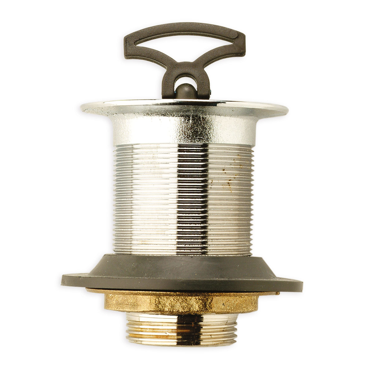 Pilettone in ottone cromato per lavello in ceramica e vasca in cemento con tappo a maniglia, senza codolo.