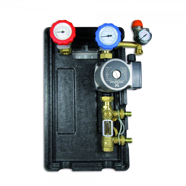 Gruppo pompa solare completo di valvole di intercettazione con termometri integrati, rubinetti di carico/scarico, valvole di ritegno, valvola di sicurezza 6 bar, coibentatura e flussimetro range 0,5 – 15 l/min.