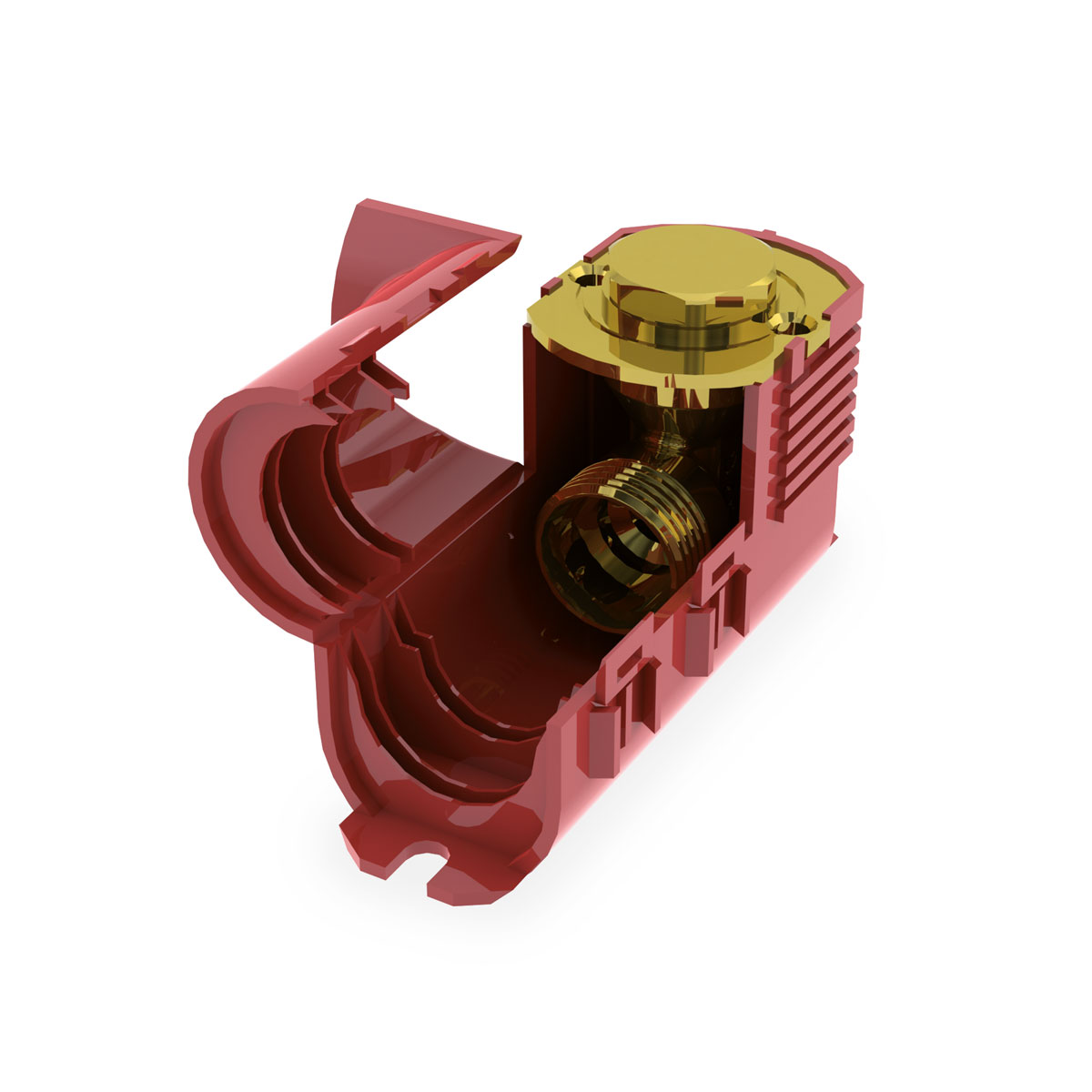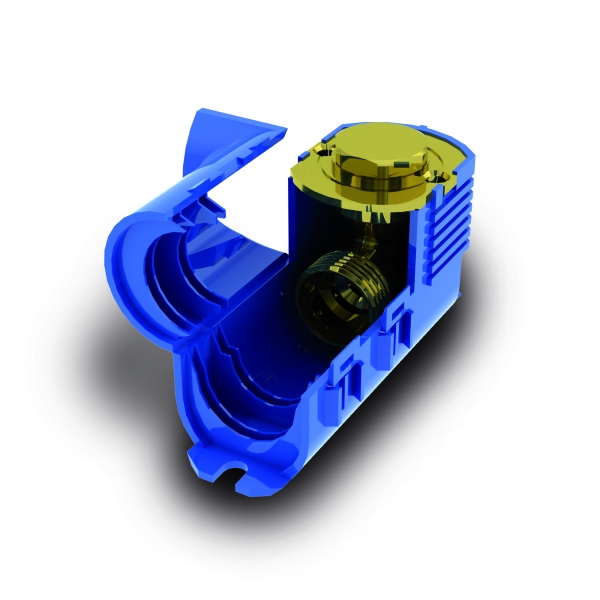 Raccordo curvo sottotraccia a 90° singolo di colore blu o rosso, senza staffa e con tappo in ottone con o-ring per prova di tenuta.