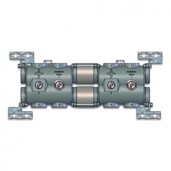 Collettore modulare da G 1”1/2, con attacchi per i gruppi da G 1”1/4 e valvole di bypass e bilanciamento. Possibilità di aprire il bypass installato su tutti i moduli, in modo da funzionare anche come separatore idraulico. Passaggio interno libero ø 45mm. (la versione CB è coibentata).