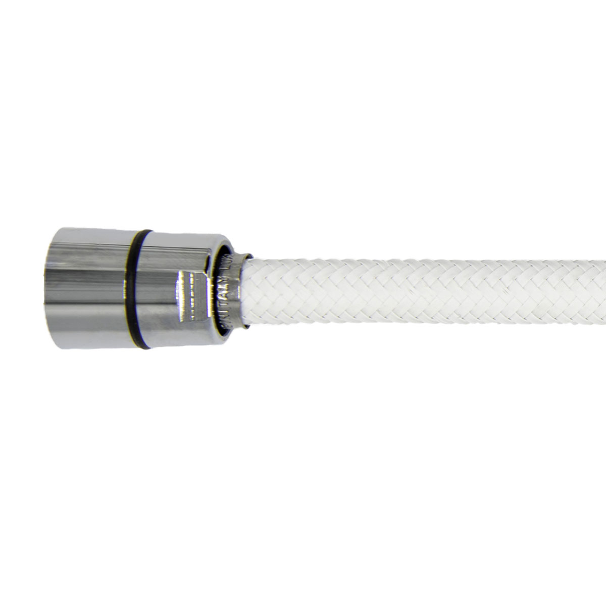 Tubo flessibile DN 8 per il collegamento di doccette estraibili pull-out / pull-down utilizzabile per rubinetti da cucina. Treccia in nylon PA6.6 colore bianco. Raccordo Maschio Girevole e Ghiera Conica con o-ring e contrappeso. Raccordi in ottone e bussole in acciaio inossidabile.